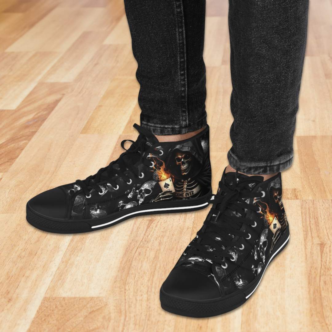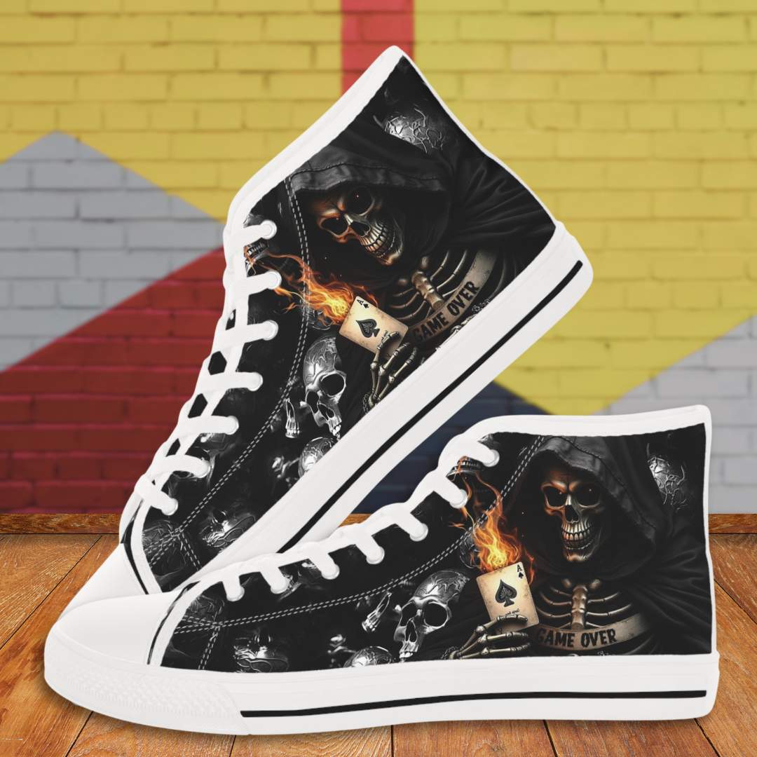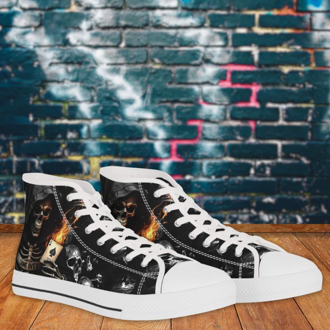 Made with breathable polyester canvas and featuring hi-poly deodorant memory foam insoles, these high top sneakers for men bear all the marks of an awesome shoe. Choose between black or white sole and laces, and enjoy the silver metal eyelets along with the lace-up closure. Add your designs and bring a bespoke staple to life.