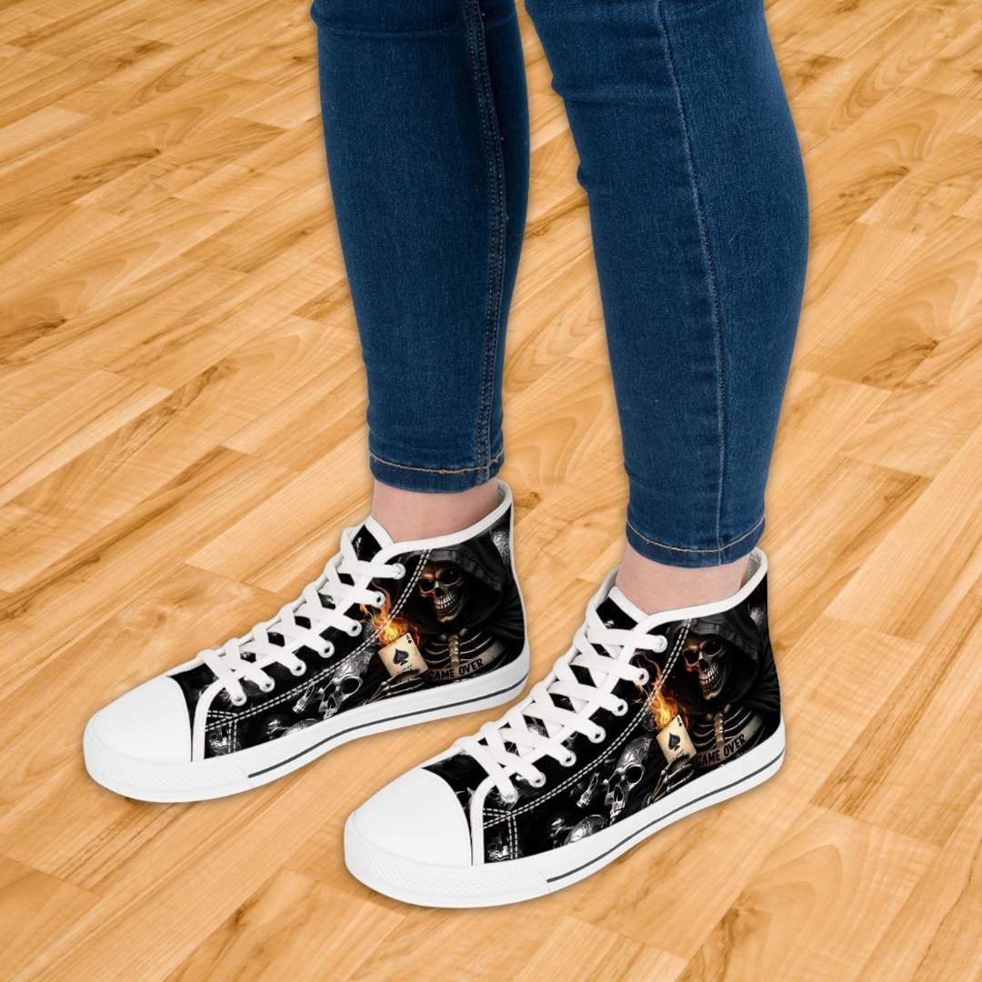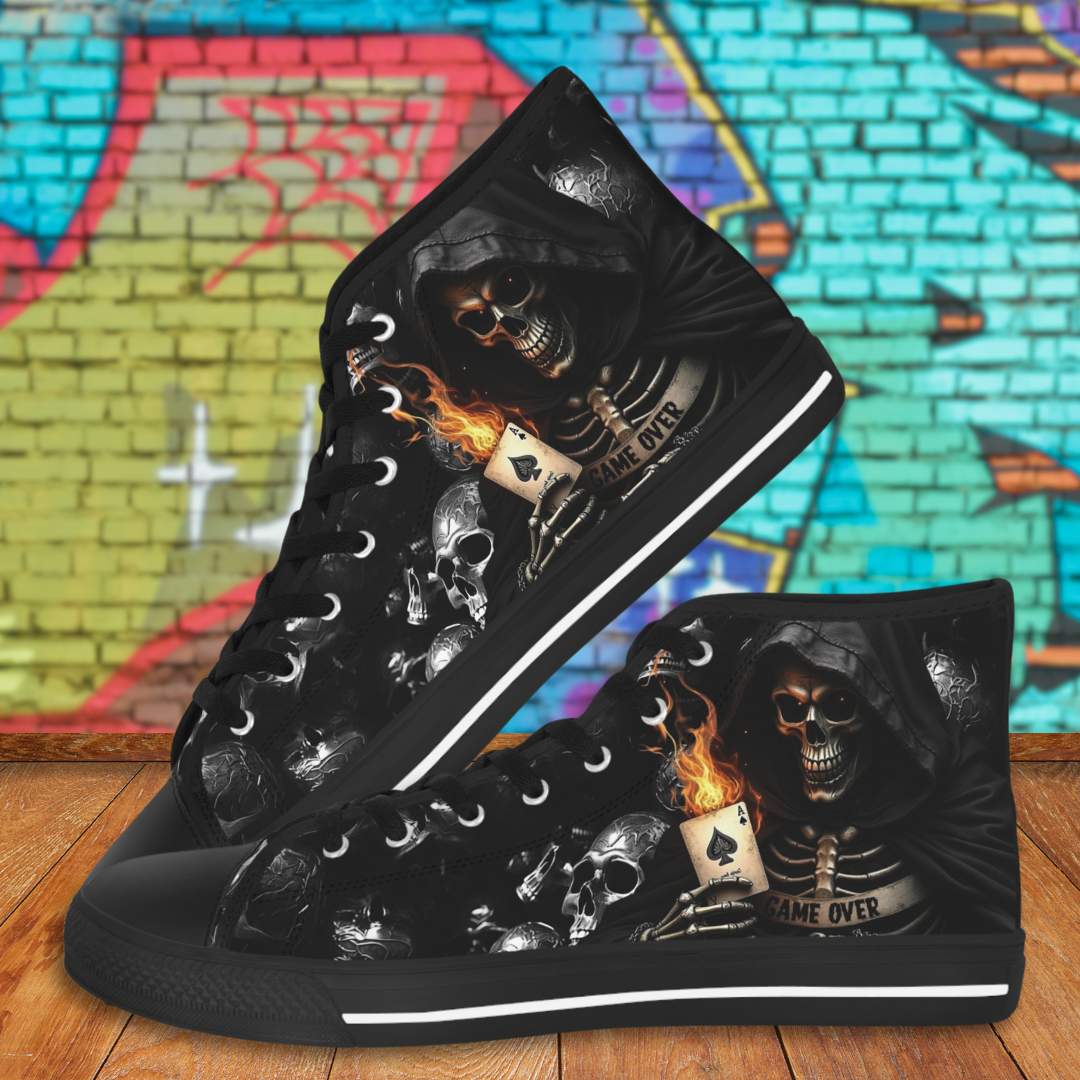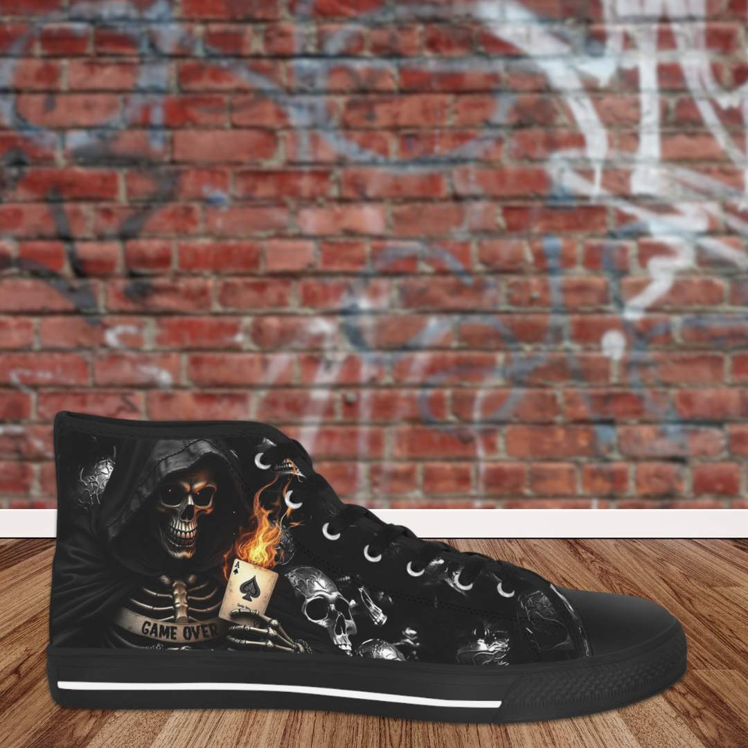 Made with breathable polyester canvas and featuring hi-poly deodorant memory foam insoles, these high top sneakers for men bear all the marks of an awesome shoe. Choose between black or white sole and laces, and enjoy the silver metal eyelets along with the lace-up closure. Add your designs and bring a bespoke staple to life.