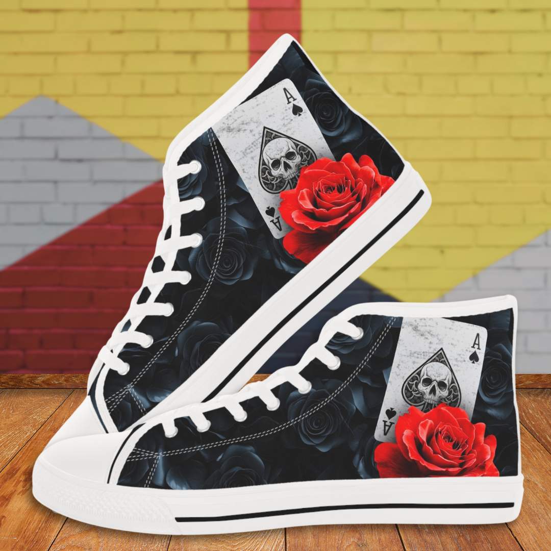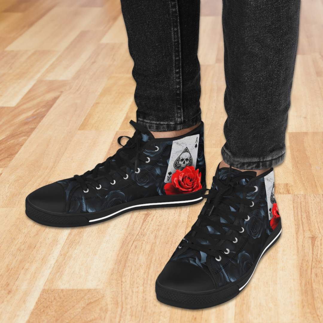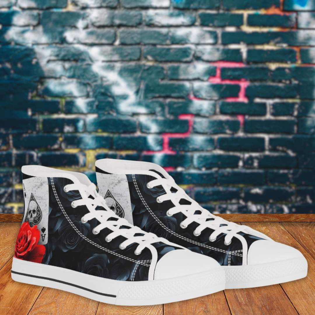 Made with breathable polyester canvas and featuring hi-poly deodorant memory foam insoles, these high top sneakers for men bear all the marks of an awesome shoe. Choose between black or white sole and laces, and enjoy the silver metal eyelets along with the lace-up closure. Add your designs and bring a bespoke staple to life.